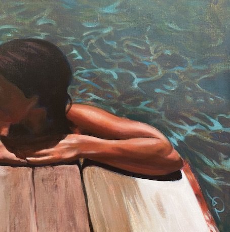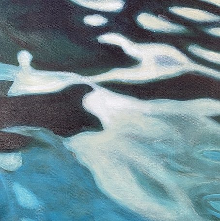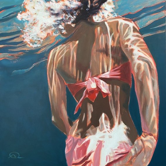 Sur celle-ci, je retrouve le travail de tout ce que j’aime, et notamment le dessin si créatif de la lumière une fois qu’elle a été transformée par l’eau. Des ombres très précises sur la peau, aux volutes très abstraites de la surface. Produire une première impression très réaliste puis laisser la place à l’imaginaire. La tapisserie d’ombres vertes sur sein gauche est ma partie préférée dans cette toile.