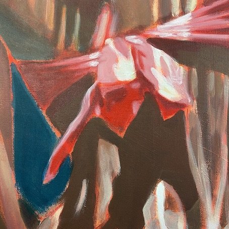 C’est une toile dont je suis fier parce qu’elle marque une étape dans ma progression. Je ne dis pas ça souvent. J’ai réussi à m’empêcher d’aller trop loin à plusieurs reprises. Peindre des philodendrons, pas vraiment en motif, mais sans logique de perspective. Ne pas retoucher le premier jet sauf pour la peau. Laisser la piscine sans eau bleue, pas même le dessin des reflets. Recouvrir d’un début de lavis rouge le bas du tableau.