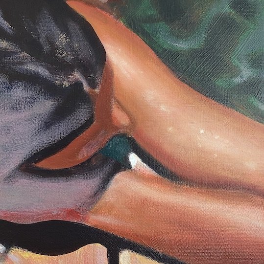 J’avais l’idée de cette image en stock depuis longtemps, matérialisée par une petite étude peinte. J’aime les coiffures chignons, et je trouve qu’il y a quelque chose de très féminin et élégant dans ce geste. Une semaine avant de démarrer cette toile, la visite de l’expo Sam Szafran au musée de l’Orangerie a été une révélation. Son obsession tardive pour les philodendrons m’a fasciné. Enfin, une semaine de travail au côté de Mike Carson l’automne dernier m’avait enseigné une forme de liberté dans la composition, et des techniques qui la rendent intéressante. Tout ce bouquet d’éléments a conduit à ce projet. Il a démarré à un moment où je venais de travailler à un rythme soutenu.