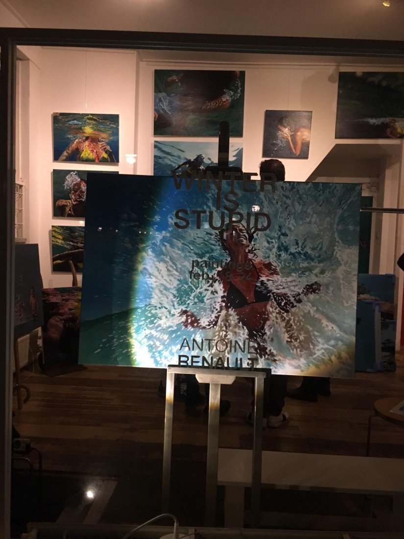 Les reflets puissants qui jouent avec la surface créent un contraste fort et imaginent ce vert émeraude dense sous lequel se faufile ma fille avant d’aller prendre son petit déjeuner. Pas même le temps d’être verni, le tableau « Under the Levrossos beach » était attrapé à la sortie de son bain via Facebook par une charmante collectionneuse en Floride. Autorisation de sortie in extremis pour être exposée à Neuilly et Gif-sur-Yvette avant de s’envoler au-dessus de l’Atlantique.