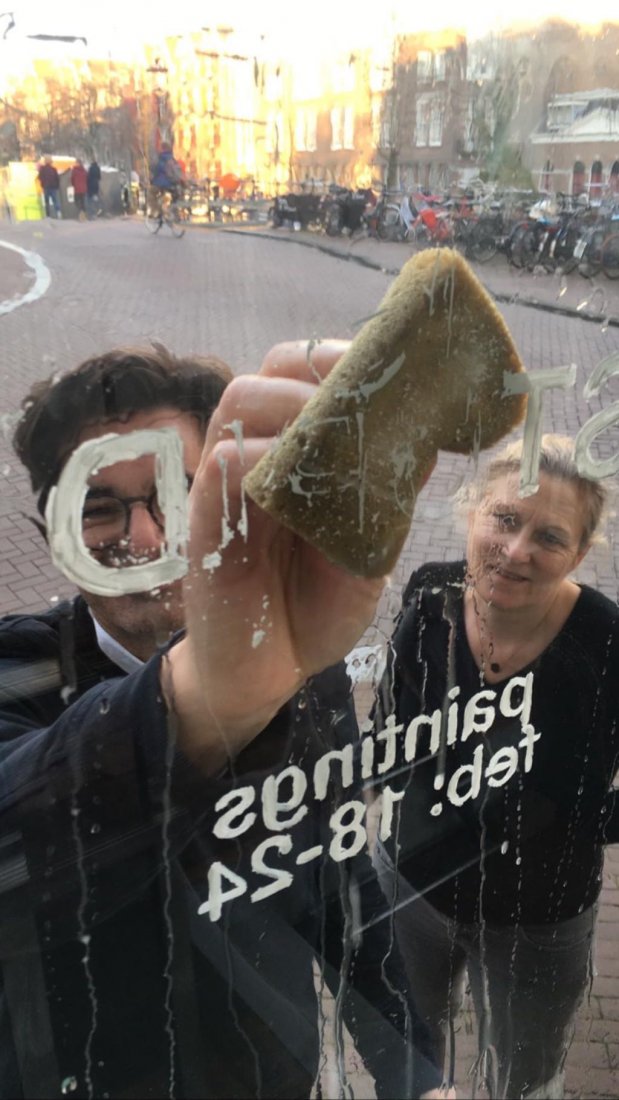 Au dernier moment de la dernière heure du dernier jour, juste avant que je referme la galerie, une belle visite surprise: une voisine proche, figure de la chanson à Amsterdam et patronne d’un très ancien bar très fameux. Elle repart avec un dessin sous le bras.