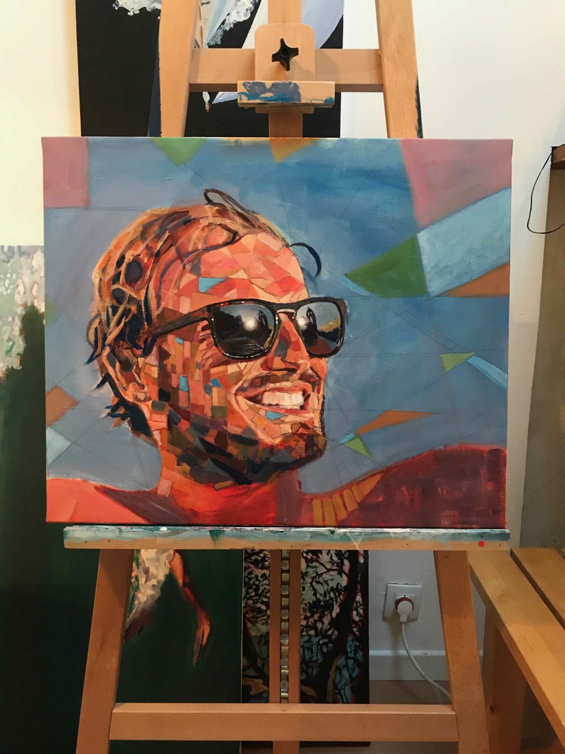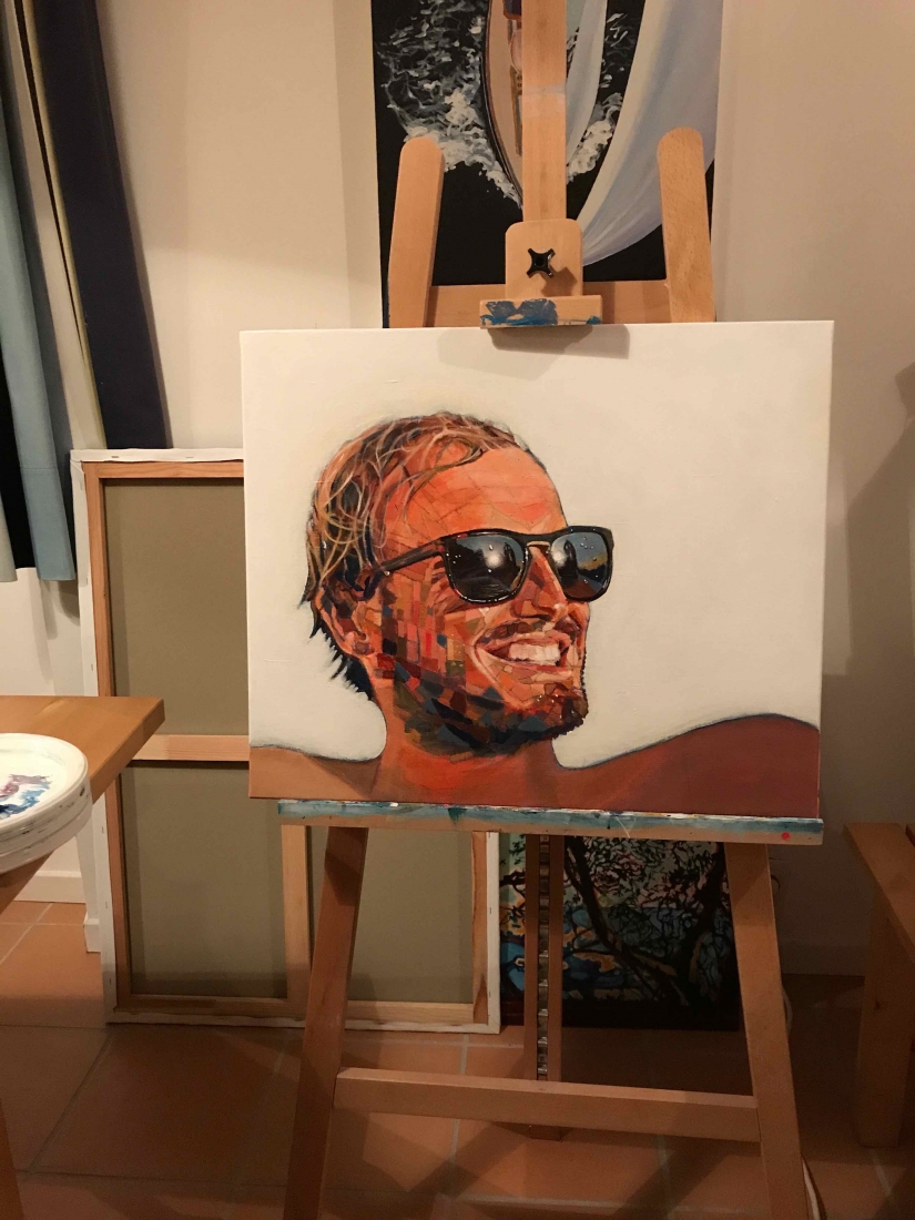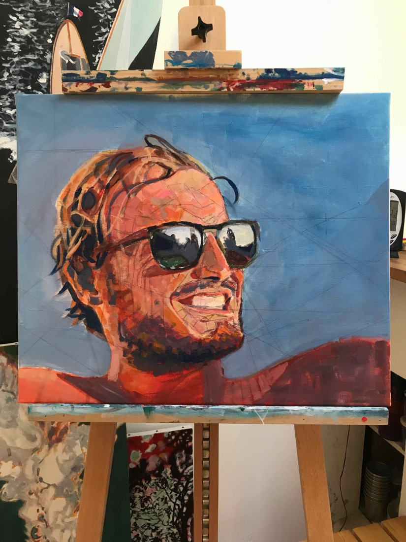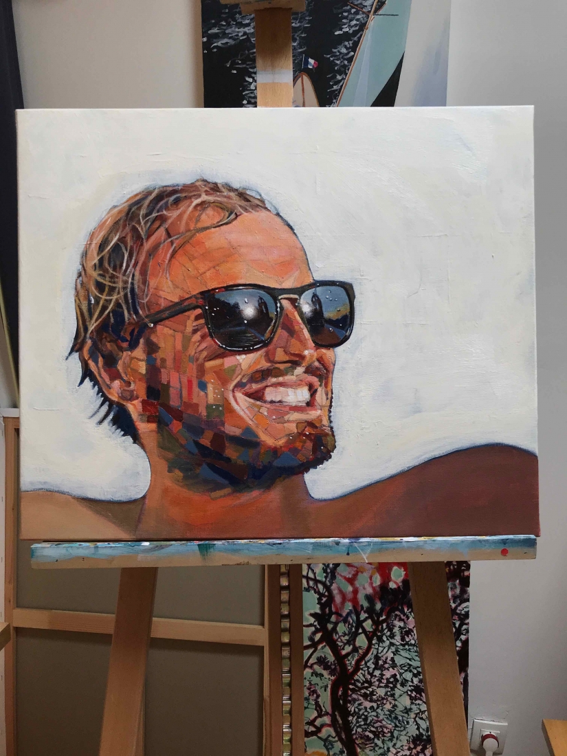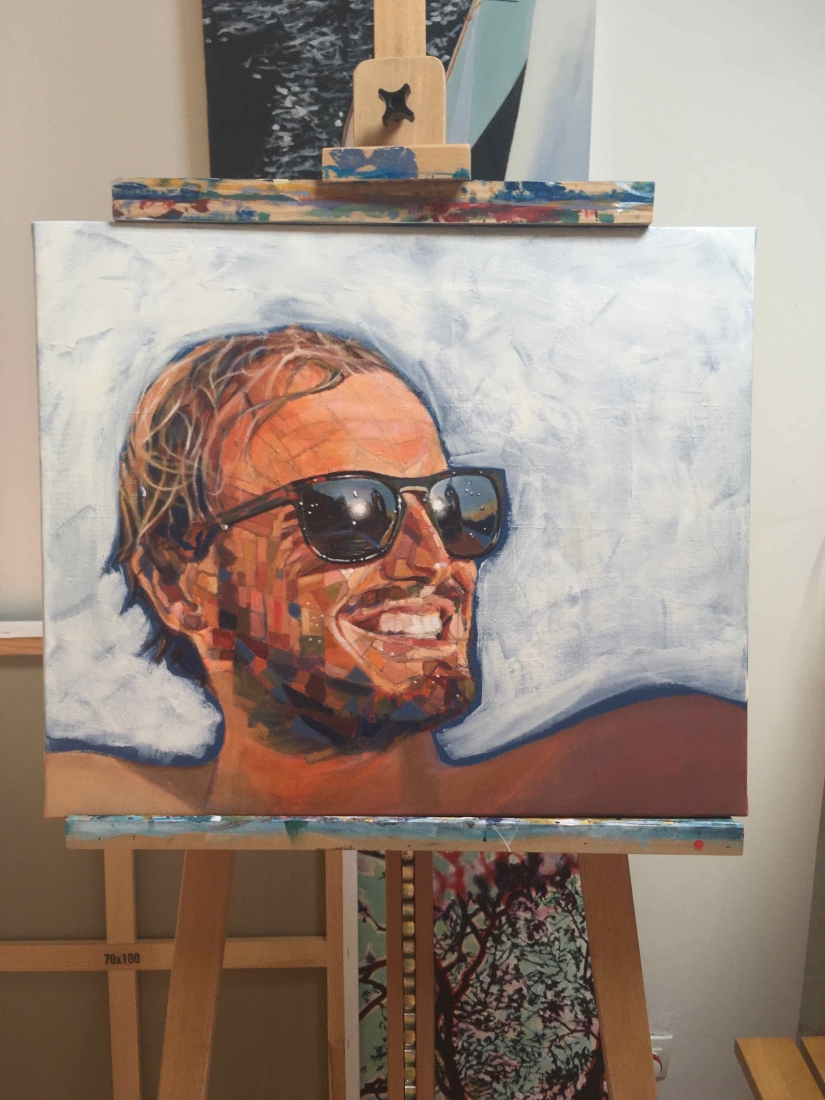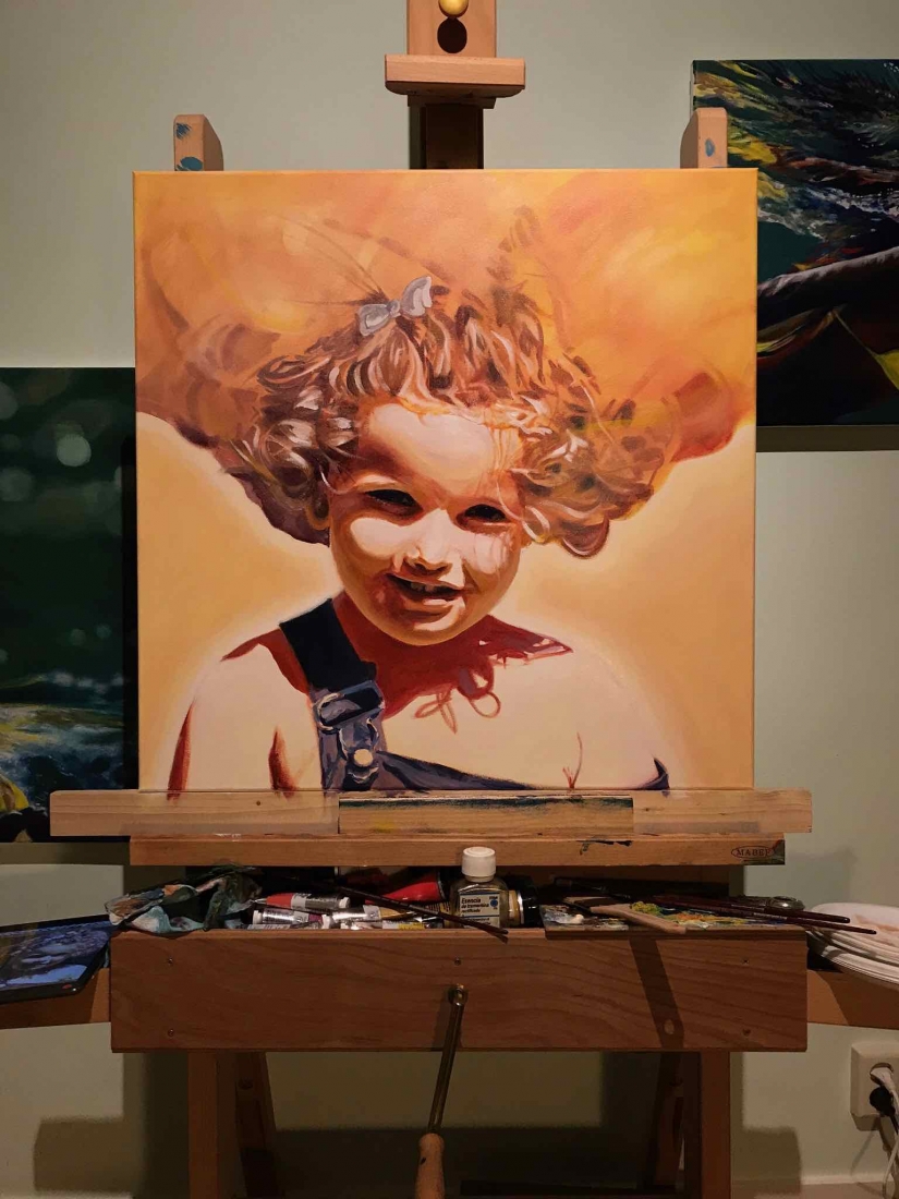 There are 2 great joys in my life as an artist: the creative process by itself, and the connections triggered by the result of it. Once upon a time, there was a Catalan art lover who used to follow my work and chat through Instagram. Her Canadian New-Brunswicker lover, who happens to work in Amsterdam, started asking if there would be a way, by any chance, to celebrate their anniversary with a portrait of his soul mate. A first secret meeting with him takes place in my studio. We browse through available pictures while tasting some goof wine… hoping one of them would be triggering the inspiration. It actually happens with that image. I liked the attitude a lot. The eyes looking down, as if lost in her thoughts. The long hair that doesn’t stop spinning right under the warm Canarian wind. This interesting hand that hesitates between a gesture of control or thinking. Many stories can start from there.