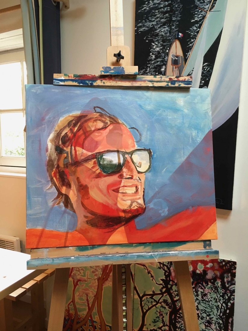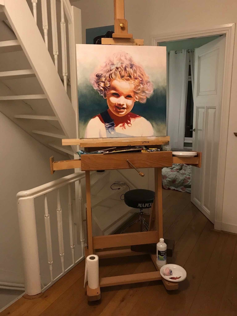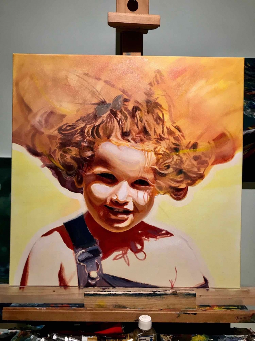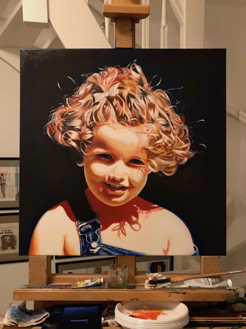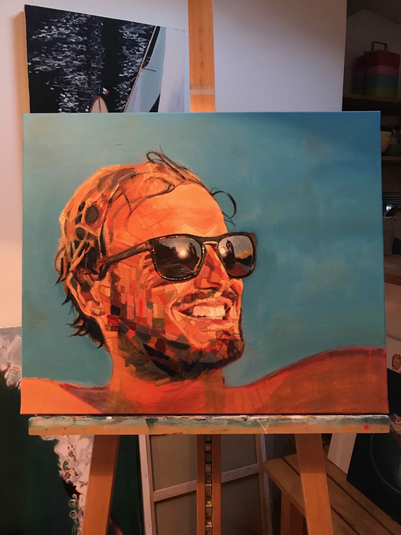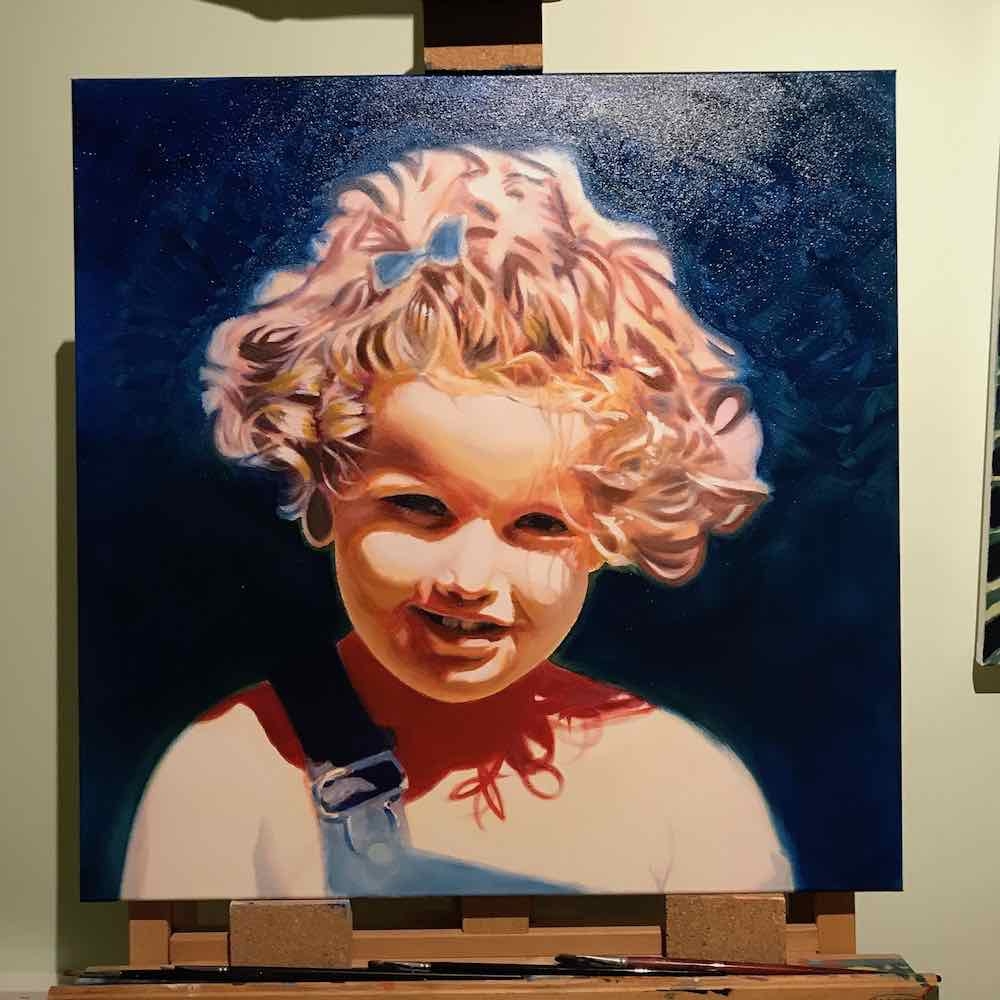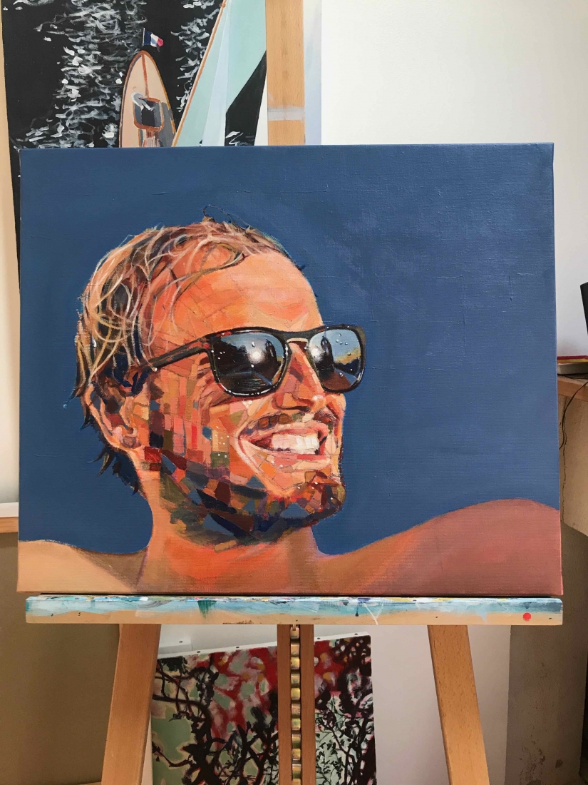 There are 2 great joys in my life as an artist: the creative process by itself, and the connections triggered by the result of it. Once upon a time, there was a Catalan art lover who used to follow my work and chat through Instagram. Her Canadian New-Brunswicker lover, who happens to work in Amsterdam, started asking if there would be a way, by any chance, to celebrate their anniversary with a portrait of his soul mate. A first secret meeting with him takes place in my studio. We browse through available pictures while tasting some goof wine… hoping one of them would be triggering the inspiration. It actually happens with that image. I liked the attitude a lot. The eyes looking down, as if lost in her thoughts. The long hair that doesn’t stop spinning right under the warm Canarian wind. This interesting hand that hesitates between a gesture of control or thinking. Many stories can start from there.