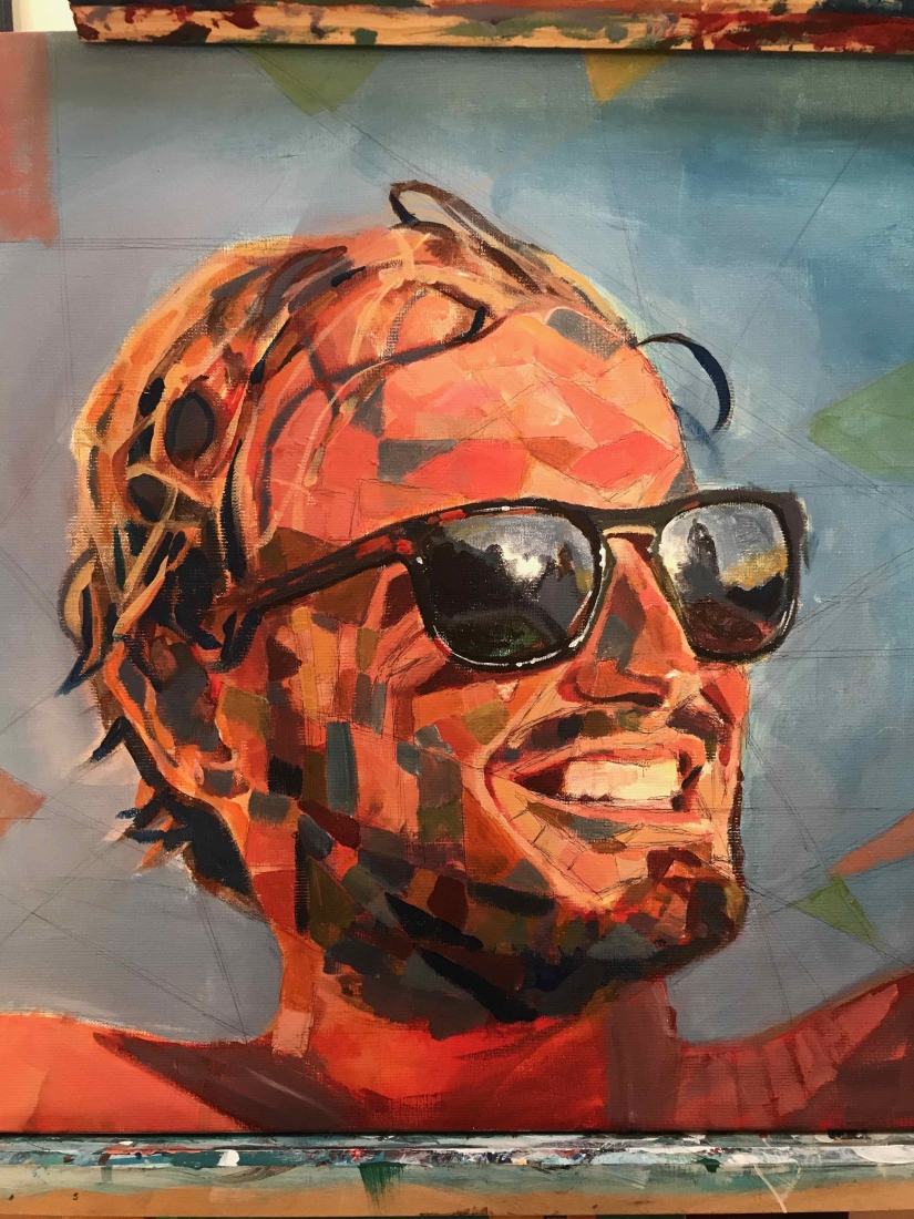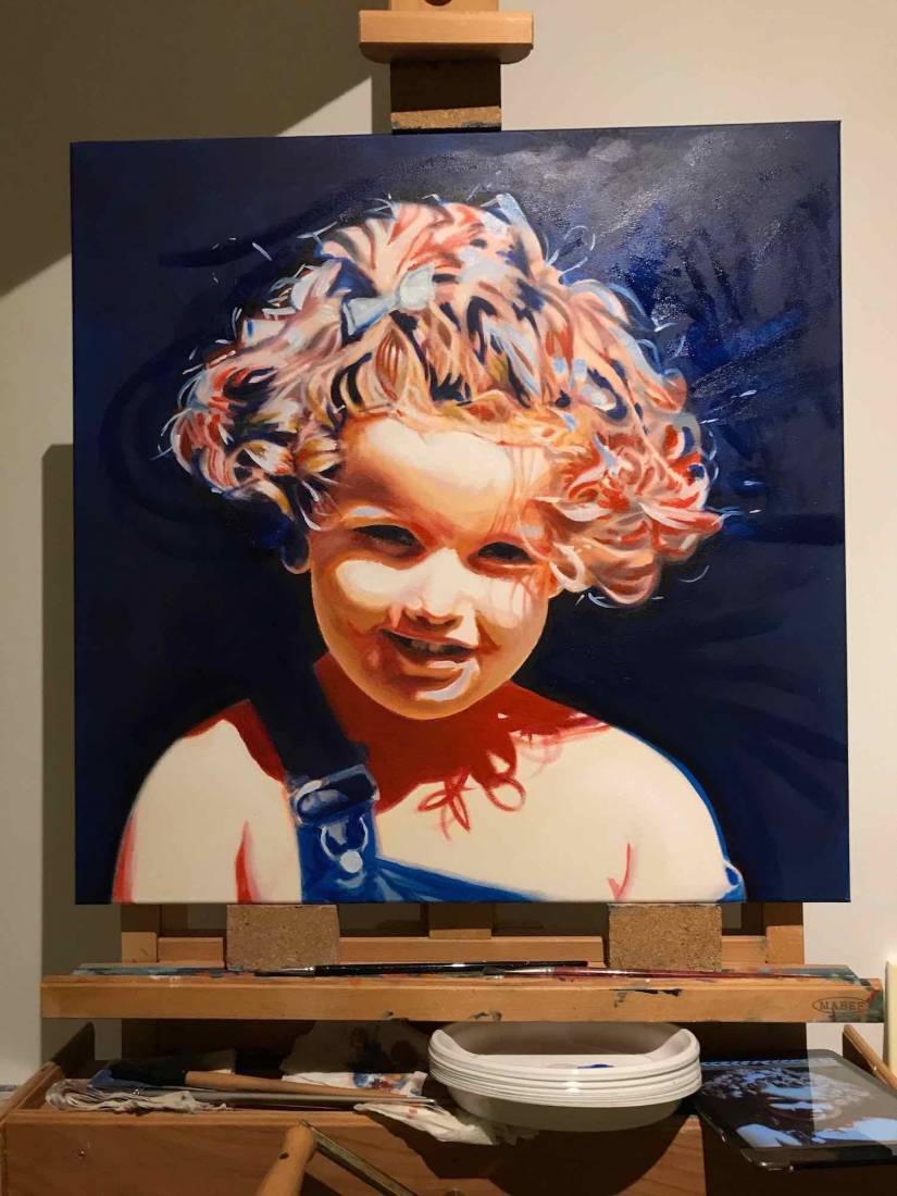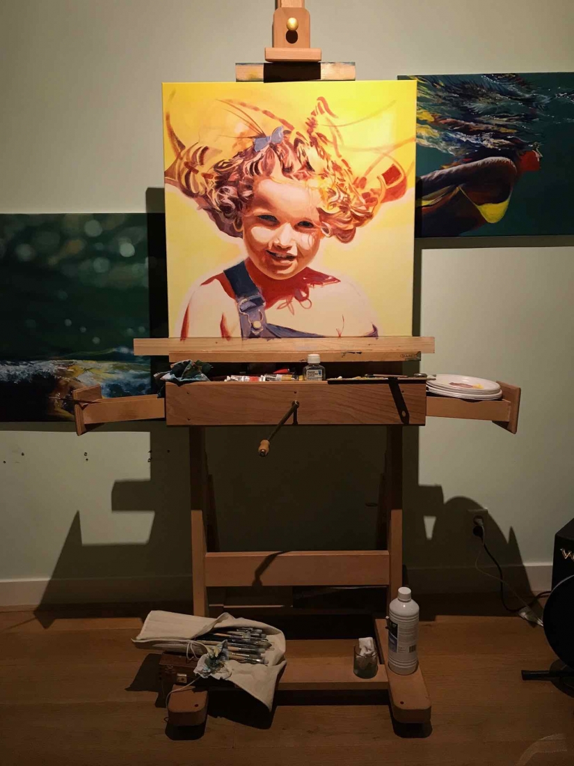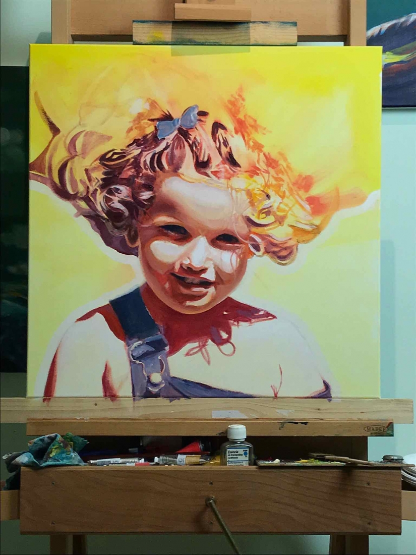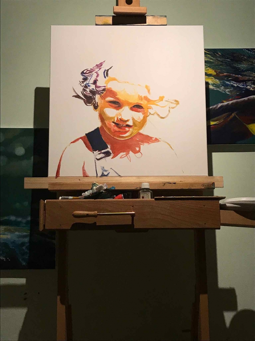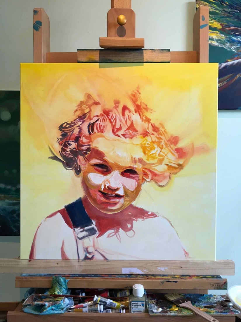 There are 2 great joys in my life as an artist: the creative process by itself, and the connections triggered by the result of it. Once upon a time, there was a Catalan art lover who used to follow my work and chat through Instagram. Her Canadian New-Brunswicker lover, who happens to work in Amsterdam, started asking if there would be a way, by any chance, to celebrate their anniversary with a portrait of his soul mate. A first secret meeting with him takes place in my studio. We browse through available pictures while tasting some goof wine… hoping one of them would be triggering the inspiration. It actually happens with that image. I liked the attitude a lot. The eyes looking down, as if lost in her thoughts. The long hair that doesn’t stop spinning right under the warm Canarian wind. This interesting hand that hesitates between a gesture of control or thinking. Many stories can start from there.
