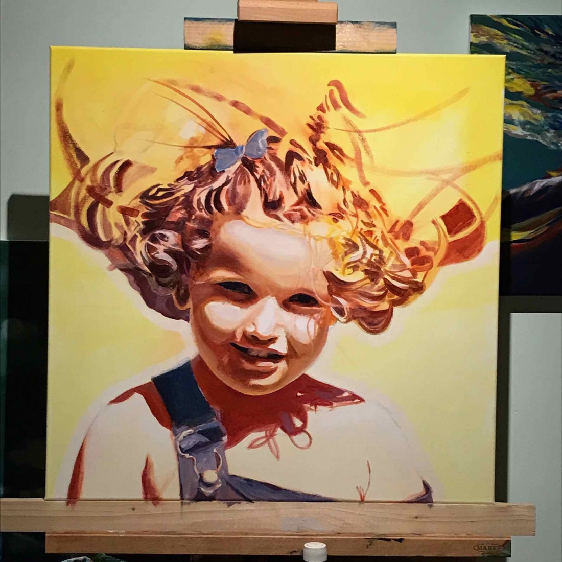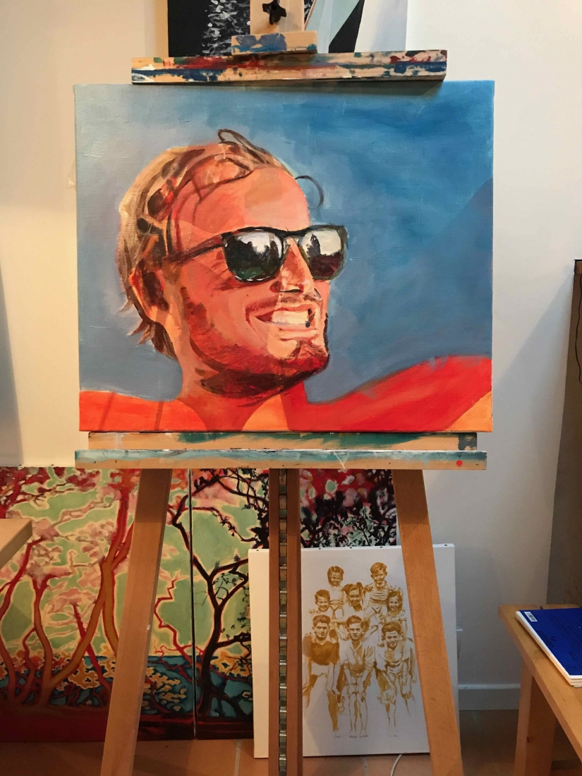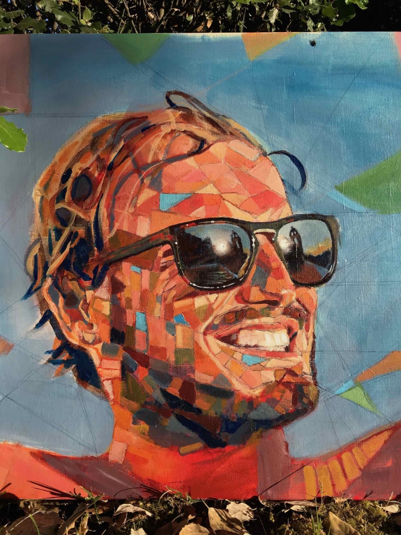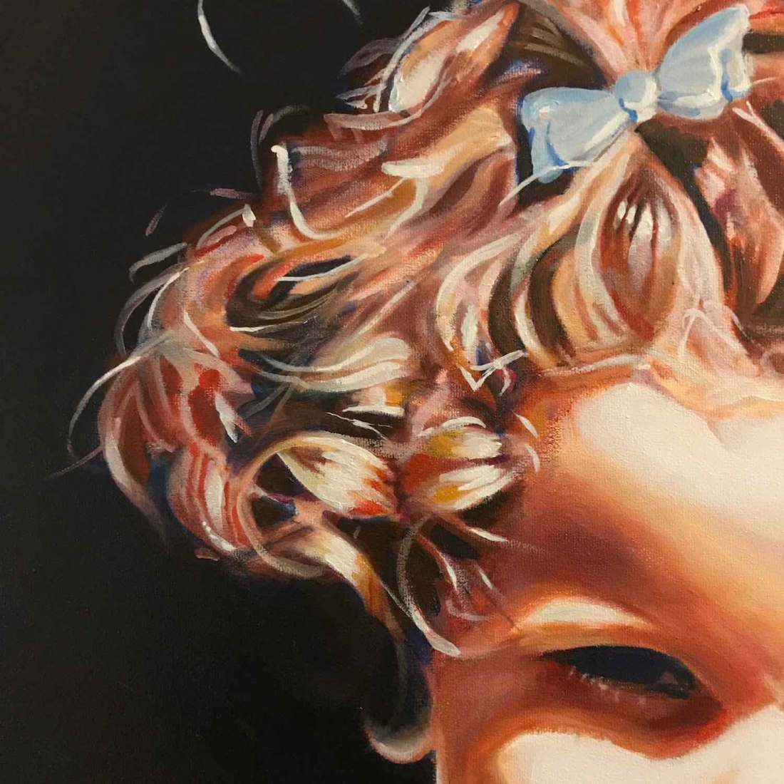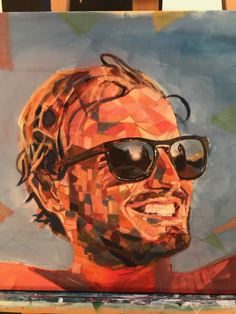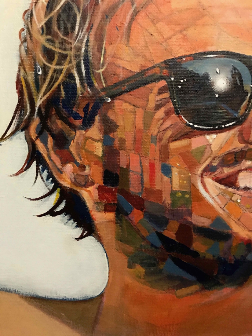 There are 2 great joys in my life as an artist: the creative process by itself, and the connections triggered by the result of it. Once upon a time, there was a Catalan art lover who used to follow my work and chat through Instagram. Her Canadian New-Brunswicker lover, who happens to work in Amsterdam, started asking if there would be a way, by any chance, to celebrate their anniversary with a portrait of his soul mate. A first secret meeting with him takes place in my studio. We browse through available pictures while tasting some goof wine… hoping one of them would be triggering the inspiration. It actually happens with that image. I liked the attitude a lot. The eyes looking down, as if lost in her thoughts. The long hair that doesn’t stop spinning right under the warm Canarian wind. This interesting hand that hesitates between a gesture of control or thinking. Many stories can start from there.