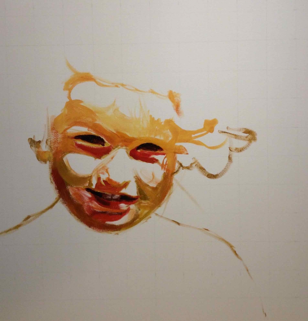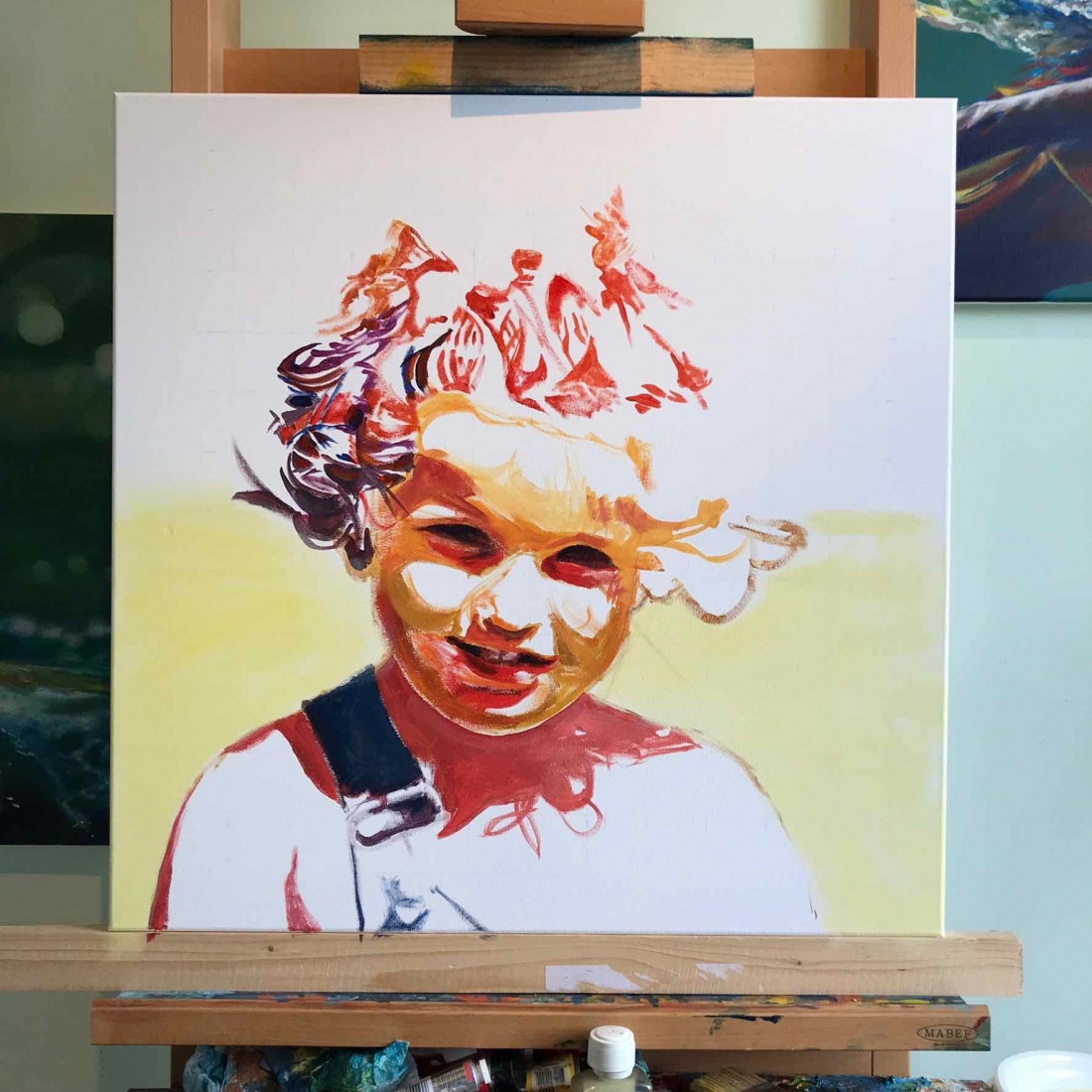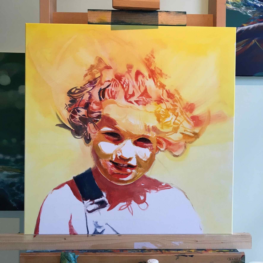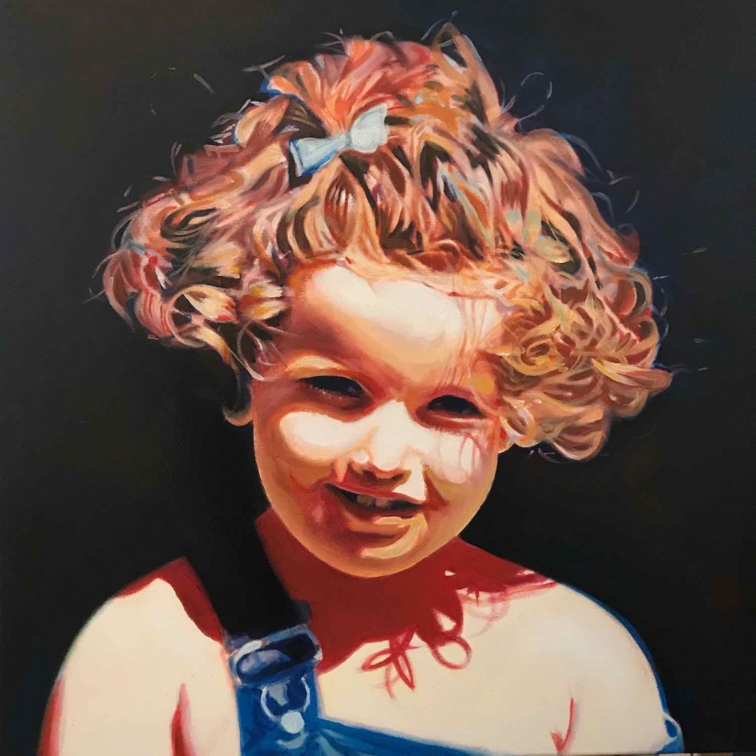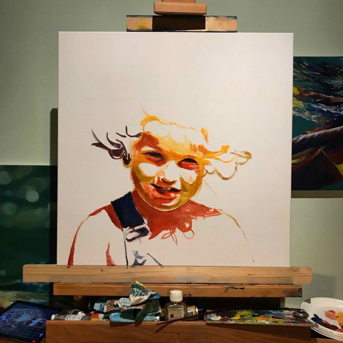 There are 2 great joys in my life as an artist: the creative process by itself, and the connections triggered by the result of it. Once upon a time, there was a Catalan art lover who used to follow my work and chat through Instagram. Her Canadian New-Brunswicker lover, who happens to work in Amsterdam, started asking if there would be a way, by any chance, to celebrate their anniversary with a portrait of his soul mate. A first secret meeting with him takes place in my studio. We browse through available pictures while tasting some goof wine… hoping one of them would be triggering the inspiration. It actually happens with that image. I liked the attitude a lot. The eyes looking down, as if lost in her thoughts. The long hair that doesn’t stop spinning right under the warm Canarian wind. This interesting hand that hesitates between a gesture of control or thinking. Many stories can start from there.