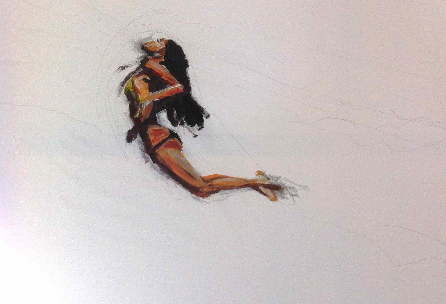 J’ai commencé par une petite aquarelle pour me faire la main. Comme si le chantier me semblait trop impressionnant pour passer directement à un grand format. Le hasard a fait qu’elle a atterri à Hawaï comme cadeau de remerciement à ma 300ème fan sur Facebook. Alexandra Gomez, une jeune et joyeuse lycéenne d’Honolulu qui emmène consciencieusement son surf à l’école pour pas rater trop de vagues en fin d’après-midi … Y’ en a quand même qui démarrent pas trop mal dans la vie !